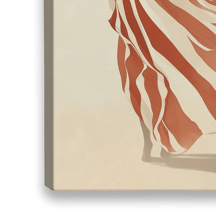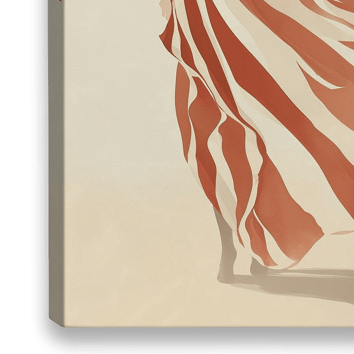 Een minimalistisch kunstwerk dat een silhouet toont in een dramatisch wapperende gestreepte cape in warme terracotta tinten. De compositie straalt elegantie en beweging uit, waarbij de vloeiende lijnen van de stof een perfect contrast vormen met de strakke achtergrond. Het spel tussen licht en schaduw creëert een tijdloze, bijna…