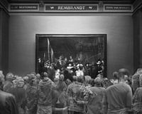Vol bewondering staan mensen stil om wellicht het beroemdste schilderij van Rembrandt, de Nachtwacht, in zich op te nemen.