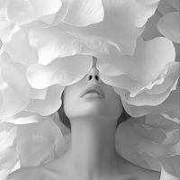 Serene en etherische schoonheid uit. Het toont een vrouwelijk gezicht, met delicate trekken, dat gedeeltelijk wordt overschaduwd door grote, overlappende bloemblaadjes in zachte witte tinten. De monochrome kleurstelling en subtiele lichtval versterken de dromerige en haast surrealistische sfeer. De vrouw lijkt in volledige overgave te…