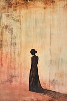 De afbeelding roept een gevoel van onzekerheid en reflectie op, waarbij de vrouw als symbool staat voor het individu dat zich in de overgang bevindt van het bekende naar het onbekende. De schaduw van haar jurk die op de vloer valt suggereert een verleden of een last die zij met zich meedraagt, terwijl de lege weg die voor haar ligt aangeeft dat de toekomst onbepaald is, zonder duidelijke richting of antwoorden. Het lichtroze achterland en de zachte, textiele achtergrond versterken het gevoel van een delicate, ongrijpbare toekomst die niet volledig zichtbaar is, maar tegelijkertijd vol potentie en mogelijkheden.