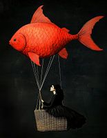 Surrealistische afbeelding van een vrouw met een zwierige zwarte jurk en zwart haar zittend in de rieten mand van een luchtballon. De ballon wordt verbeeld door een grote rode goudvis. De achtergrond is donker en zwart het geen de afbeelding een sinistere uitstraling geeft. Dit intrigeert vanwege de tegenstelling van het donker en het vrolijke sprookje waarin alles mogelijk is. Fantasie.
