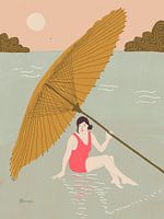 Deze illustratie toont een vrouw genietend van de avondzon, zittend in de brandig van een rustige zee. De grote okergele parasol en haar felroze badpak zorgen voor een leuk accent.