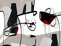 Abstracte vormen in zwart, grijs en rood zweven vrij in de ruimte tussen sterk gemoduleerde zwarte lijnen. Abstract minimalisme door Roberto Moro.