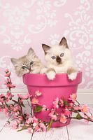 Twee kittens in een roze bloempot en roze bloemen en barok achtergrond