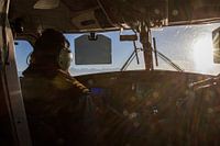 Samen met de piloten vliegen we over het Himalaya gebergte van Nepal. We worden verblind door de zon. We vliegen naar Lukla.