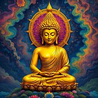 De subtiele verlichting benadrukt de contouren van het beeld en laat het bijna zweven in de lucht, alsof het omgeven is door spirituele energie. Deze minimalistische compositie nodigt de kijker uit om even stil te staan en bij zichzelf naar binnen te kijken. Het creëert een sfeer van contemplatie die aanzet tot reflectie en innerlijke rust. Dit beeld legt niet alleen de fysieke aanwezigheid van de Boeddha vast, maar ook de essentie van vrede en verlichting die hij belichaamt - een uitnodiging om na te denken en op zoek te gaan naar innerlijke balans.