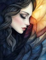 Een mooie vrouw met gesloten ogen en vloeiend haar is afgebeeld in een droomachtige stijl. De achtergrond betovert met zachte, wervelende kleuren die het etherische effect versterken.