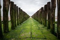 In de groene golfbreker met helemaal aan het einde de zee bij Zoutelande (provincie Zeeland in Nederland).