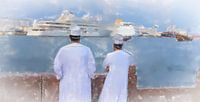 Mannen in traditionele Arabische klederdracht kijken naar de cruiseschepen met toeristen in de haven van Muscat, Oman