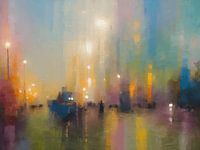 Stap in de levendige wereld van abstracte kunst met dit adembenemende schilderij van een binnenstad, waarin pasteltinten van paars, groen, geel en blauw naadloos in elkaar overgaan. Dit unieke kunstwerk, met zijn vloeiende kleurovergangen, onthult pas op een afstand het subtiele silhouet van een bruisende stad, waar mensen in beweging…