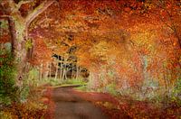 Een fotobewerking van een tafereel in het bos. Links is de stam van een oude Eik zichtbaar en naar het midden toe loopt een weg de hoek om. De roodbruine kleur van de bladeren maakt het een herfst beeld.