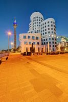Uitzicht op een van de drie Gehry-gebouwen aan de Neuer Zollhof in de Düsseldorfse Mediahaven en de Rijntoren op de achtergrond. Na de schemering baadt het plein in een oranje licht.