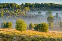 Laatzomerse ochtendstemming in de mistige Totengrund op de Lüneburger Heide. De zon komt langzaam over de berg heen en verlicht het landschap met zijn warme licht.