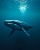 De walvis is een vaardige zwemmer en glijdt sierlijk door het water. Af en toe verlaat hij de lucht met een krachtige sprong voordat hij weer elegant de diepte in duikt. Het geluid van zijn ademhaling, die lijkt op een zachte waaier van mist, mengt zich met het zachte kabbelen van de golven. Kleine vissen spelen om hem heen en dansen in glinsterende scholen door het glinsterende wateroppervlak.