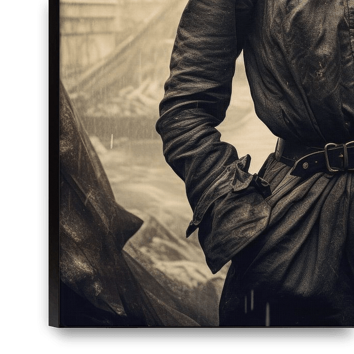 In dit opvallende portret staat een jonge vrouw centraal, die een rustige, vastberaden aanwezigheid uitstraalt ondanks de ongunstige omstandigheden van de regen. Haar kleding is eenvoudig en functioneel, maar de details van haar gevlochten haar en het landschap om haar heen voegen een diepere laag toe aan het beeld. De achtergrond, die…