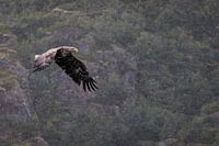 Zeearend vliegt door de regen. In de Trollfjord, Noorwegen.