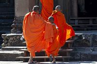 Hun feloranje gewaden stromen als levende vlammen over de eeuwenoude trappen van Angkor Wat. De zon baadt het landschap in warm licht, alsof zelfs de stenen het heilige pad van hun stappen willen volgen. Het is een moment voorbij de tijd - waar geschiedenis, geloof en het heden samensmelten.