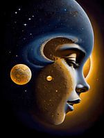 Dit intrigerende surrealistische schilderij neemt je mee naar de uithoeken van het universum. In de stijl van science-fiction ontvouwt zich tegen een diepzwarte achtergrond een fascinerend portret van een gezicht dat zowel vertrouwd als mysterieus aanvoelt. De kosmische elementen – zwevende planeten, glinsterende sterren en buitenaardse lichtaccenten – voegen een mystieke sfeer toe en laten je steeds nieuwe details ontdekken. Laat je betoveren door dit unieke kunstwerk dat je blik blijft vasthouden en je verbeelding prikkelt. Perfect voor liefhebbers van het ongewone en grensverleggende kunst!