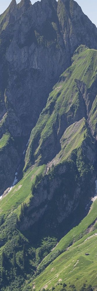 De Höfats rijst majestueus op in het midden van de Allgäuer Alpen - een koningin van rotsen en groen. Op deze heldere zomerdag, gezien vanaf het smalle pad van de Laufbacher-Eck, lijkt de wereld in stil ontzag te blijven hangen. De flanken van de Höfats, scherp en steil, dragen het weelderige kleed van de zomer: levendig groen, afgewisseld met ruwe richels en schaduwen. Als een machtige golf van bevroren beweging rijst hij op naar de smetteloos blauwe hemel, zijn wilde gezicht tegelijk afstotend en aantrekkelijk.