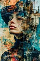 Het gezicht van een vrouw, omlijst door een stedelijk tafereel, rijst majestueus op in dit werk. Met een lichte glimlach en zelfverzekerde blik draagt ze een brede hoed die de indruk van een mysterieus karakter versterkt. Op de achtergrond rijzen verweerde gebouwen op, die de adem van verhalen en herinneringen uit het verleden meevoeren naar het heden.