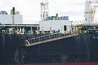 De bemanning aan dek. De loodsladder hangt al over de reling. De gangway wordt klaargemaakt door de bemanning. Het schip vaart eg van de kade. De loods gaat aan boord komen. De bemanning in witte overalls en de witte veiligheidshelmen vallen goed op boven de zwarte scheepsromp van de tanker.
