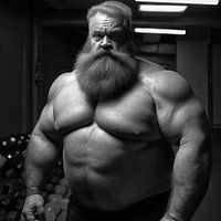 Een zeer sterke, gespierde man met baard poseert in een fitnessstudio in de stijl van een zwart-witfoto.