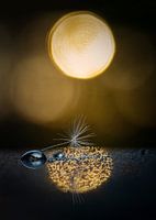 Een paardebloempluisje ligt in een regendruppel op een glad oppervlak onder de opkomende zon.