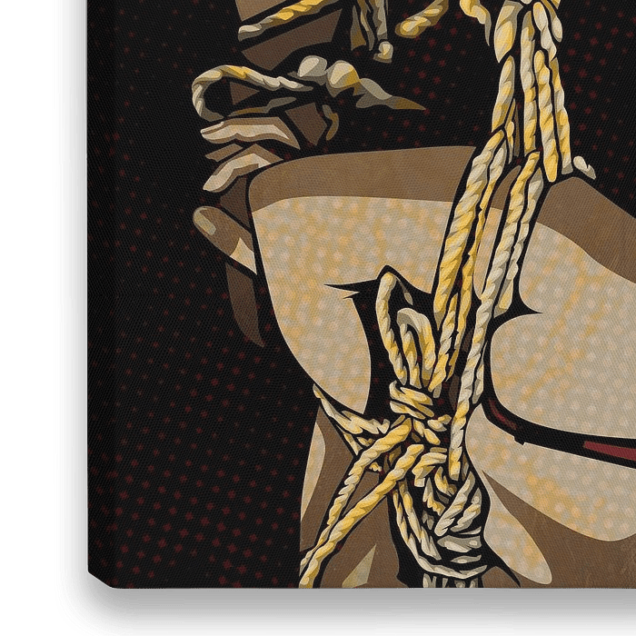 Het werk toont een grafisch gestileerde close-up van touwen die in complexe patronen met elkaar verweven zijn. Het beeld concentreert zich op het precisiewerk van de knopen en de spanning die door de touwen wordt gecreëerd. De touwen zijn gedetailleerd bewerkt, met zichtbare textuur en fijne arceringen, waardoor een bijna sculpturaal…