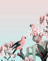 Exotische parkieten met tropische bloemen en planten in pasteltinten