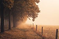 In oktober zijn de lindebomen al herfstachtig geworden. Direct naast de bomenrij begint de veeweide, die door een hek van het voetpad is gescheiden. De mist vertroebelt het zicht in de verte.