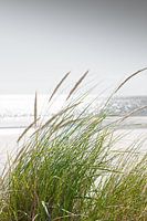 Foto met achtergrondverlichting van fijn duingras en helmgras op een duin op een wit zandstrand.