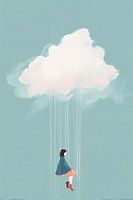 Een illustratie in zachte pasteltinten toont een poëtisch tafereel van een figuur die schommelt aan een roze wolk. De minimalistische stijl en de serene mint-groene achtergrond creëren een gevoel van rust en gewichtloosheid. Dunne, verticale lijnen verbinden de schommel met de wolk, als ragfijne regendruppels die de aarde niet bereiken.