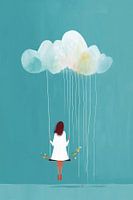 Een illustratie in zachte turquoise tinten toont een dromerige scène waarin een figuur in een witte jurk schommelt aan een wolk. De wolk is zacht en pluizig geschilderd in witte en pastelachtige tinten, terwijl dunne lijnen als regendraden naar beneden lopen. Het beeld straalt rust, onschuld en een vleugje magisch realisme uit.