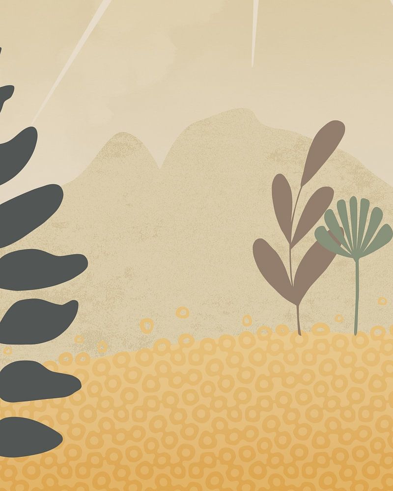 Minimalistisch-abstract landschap met vier gestileerde bomen, weilanden, een berg in de verte en de zon hoog boven alles. De weilanden en de zon zijn versierd met grafische elementen, en texturen breken de kleurvlakken op en geven de illustratie een speels tintje.