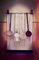 Een metalen plank met kookgerei hangt aan een oude keukenmuur. Oude roestige pannen en spatels.