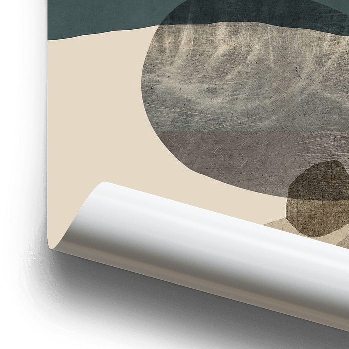 Abstracte vormoverlappingen in zachte beige-groene tinten kenmerken dit abstracte minimalistische werk van Roberto Moro. De neutrale kleuren passen perfect in elke woonkamer.