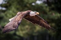Een Amerikaanse zeearend, Haliaeetus leucocephalus, vliegt over zijn territorium.