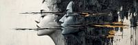 Twee vrouwelijke profielen in een abstracte omgeving. De getextureerde penseelstreken geven de afbeelding een driedimensionale diepte en dynamiek die het oog van de kijker gevangen houdt. Gouden accenten zorgen voor een luxueuze en elegante toets. Dit werk is perfect voor moderne interieurs die op zoek zijn naar een combinatie van hedendaagse esthetiek en diepe symboliek. Het spreekt zowel het oog als de geest aan en nodigt de kijker uit om de diepere betekenis en subtiele details te verkennen. Een ideaal stuk voor kunstliefhebbers die het buitengewone waarderen. De unieke gezichten zijn gemaakt in samenwerking met innovatieve AI.