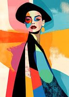 Dit kunstwerk laat een figuur zien die zich vormt uit vlakken, lijnen en kleurvlakken die elkaar snijden en overlappen. De blik is sterk gericht op de toeschouwer, wat zorgt voor directe aanwezigheid. Elk element in het beeld draagt bij aan een gevoel van eigenheid en kracht, zonder dat er sprake is van overdreven beweging of detail.…
