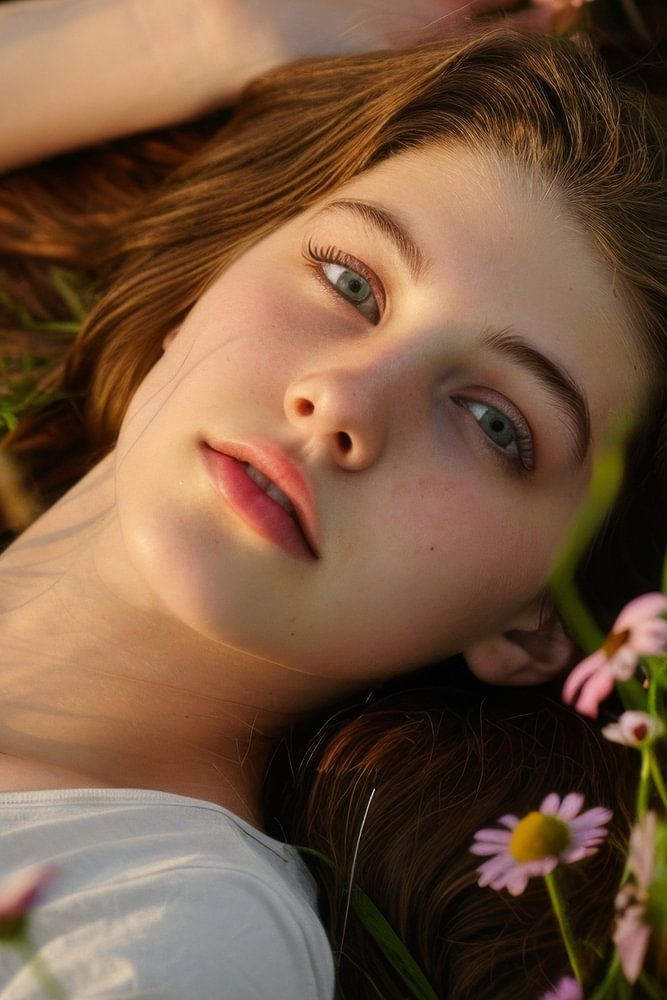 Een meisje ligt midden in een bloeiende zee van weilanden, omringd door kleurrijke wilde bloemen. Haar lange, glanzende haar versmelt met de natuur, terwijl haar stralende blik de schoonheid van haar omgeving weerspiegelt. De zachte belichting geeft de foto een dromerige, bijna magische sfeer. Een perfect moment van harmonie tussen mens en natuur.