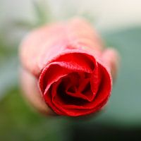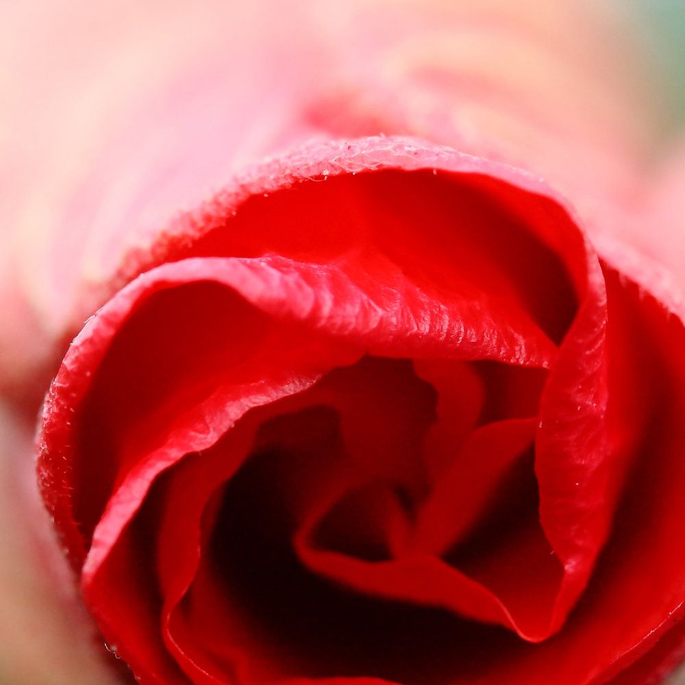 Een macro opname van een roos met prachtig opgekrulde bladeren en een felrode kleur. Door het gebruik van een groot diafragma is alleen de 'ingang' van de roos zichtbaar.