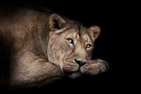 Koop de foto In het donker ligt een roodharige lome leeuwin met open ogen in profiel, een snuit en een krachtige van Michael Semenov op canvas, aluminium dibond, (ingelijste) fotoprint, behang en ArtFrame, op maat geprint in Fine-Art kwaliteit.