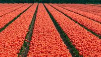 Rode tulpen staan in het gelid, rij aan rij naast elkaar in een bollenveld bij Bergen aan Zee en Egmond in Noord-Holland. Nederland staat bekend om zijn enorme uitgestrekte bollenvelden in de lente, waarin tulpen in allerlei kleuren groeien voor de bloemenhandel. Die velden reiken soms tot de horizon en geven fel kleur aan het landschap.