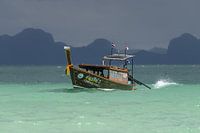 Voor de donkere silhouetten van verre eilanden, te midden van turkooisgroene golven, schommelt een houten boot - kalm maar levendig. Het draagt de naam "Chanavip 7", gehuld in de geur van zout water en verhalen gedragen door de wind. Erboven wapperen Thaise vlaggen in de wind, trots en zacht tegelijk - een groet aan de hemel en de…