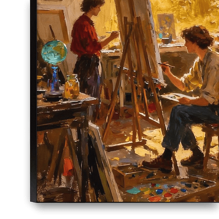 Een ruim atelier, overspoeld door intens, goudkleurig licht. Verschillende kunstenaars werken geconcentreerd aan hun ezels, omringd door verf, doeken en schetsen. Het monumentale raam lijkt bijna een eigen compositie en bepaalt de totale uitstraling van de ruimte. De ruwe, gestructureerde schilderstijl versterkt de materialiteit van de…