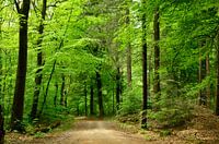Een foto van beukenbomen in het bos die net verse bladeren hebben. Een pad loopt het bos in met aan weerszijden struiken en bomen. Zacht licht valt op het bladerdak.