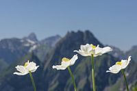 Hoog boven de zacht glooiende dalen van de Allgäuer Alpen, langs de Laufbacher-Eckweg, ontvouwt zich een magisch natuurspektakel. Op de voorgrond wiegen tere witte alpenanemonen (Pulsatilla alpina ssp. alpina) in het warme licht van de zomerzon. Hun tere bloemblaadjes glanzen puur en helder tegen het indrukwekkende panorama van de…