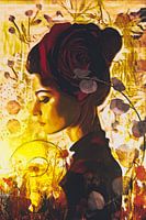 In het licht van de gloeiende drie, dat is wat hier gebeurt. De drie staat symbool voor harmonie, samenhang, wijsheid en begrip en is vaak onderdeel van religies, mythologie en kunst. Vandaar ook dat deze 3 gloeit en gewoon licht afgeeft. De dame put hier blijkbaar kracht uit en is daarom onder de indruk van dit getal. De gloed van het getal is terug te vinden op haar gezicht. Er valt een warme gloed op haar geconcentreerde gezicht. Ze heeft een grote diep donker rode roos in haar haar, een mooi teken van de liefde. Er groeit ook een tak Eucalyptus langs haar hoofd. Die eucalyptus staat voor een verbinding met jezelf, voor het loslaten van de negatieve energie die je plaagt en voor het openen van je je hart voor de liefde. De kleuren van dit werk zijn warm en gaan van geel, naar donker rood en taupe en uiteraard in meerdere tinten.