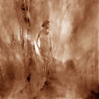 Een jonge, gracieuze vrouw beweegt zich in een abstract geschilderde kamer, omgeven door licht in zachte sepiatinten.