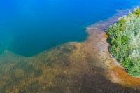 Als je vanuit de lucht dingen kunt bekijken zie je ze echt heel anders dan vanaf de waterkant zoals bij dit kleine eilandje gelegen in een meer. Je ziet nu perfect hoe het roestbruine water aftekent in het water tegen de prachtige blauwe kleur van het meer.